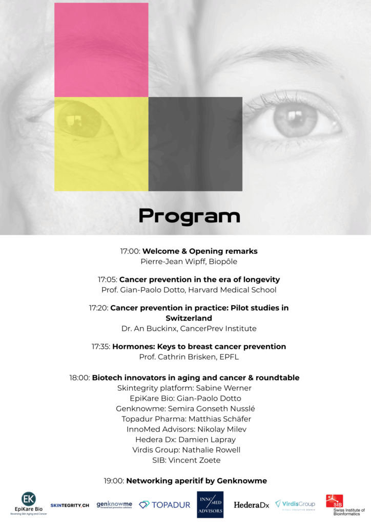 Join us on World Cancer Day, February 4, 2026, at the BiopĂ´le in Lausanne for a focused evening bringing together leaders in translational medicine to explore opportunities at the intersection of aging and cancer. The event will convene scientists, clinicians, biotech innovators, investors, and healthcare stakeholders to discuss emerging research, translational pathways, and practical approaches to cancer prevention in the context of longevity. The program includes expert talks, an interactive Biotech Innovators in Aging and Cancer session, and the launch of the Cancer Prevention Institute Translational Hub, followed by a networking aperitif to foster collaboration and partnership.